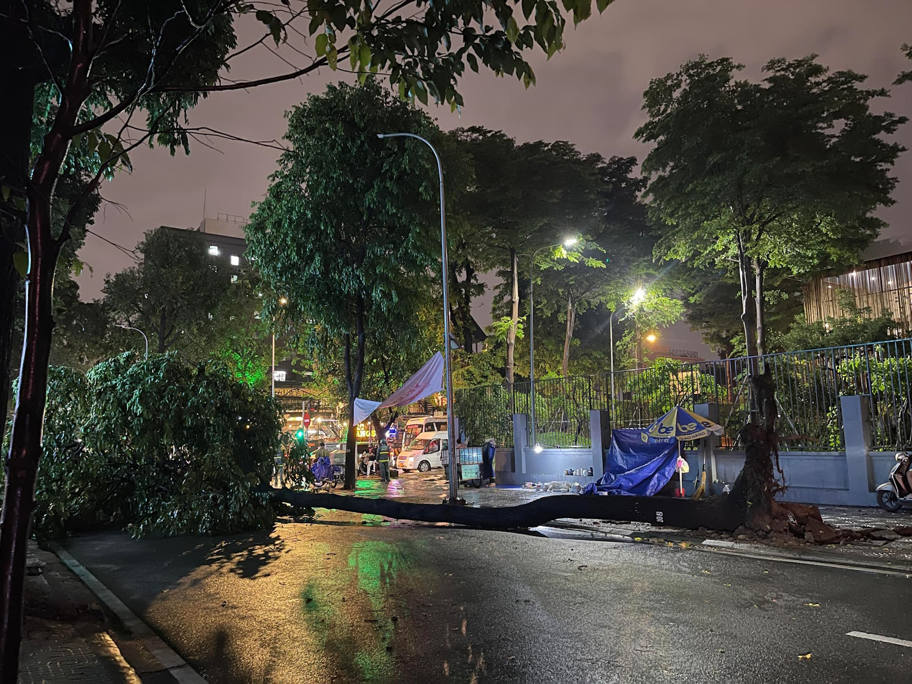 Thời điểm trên, tại quận 1 có mưa giông lớn. Một cây dầu đường kính gần 30cm cao hơn 10m bất ngờ ngã ra đường.