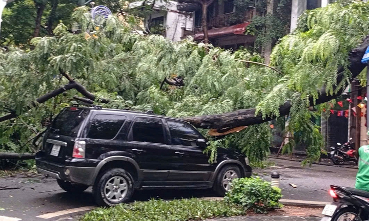 Mưa lớn kèm theo gió giật mạnh làm gãy cây phượng trên phố Tràng Thi (quận Hoàn Kiếm, Hà Nội), đè trúng 3 ô tô.