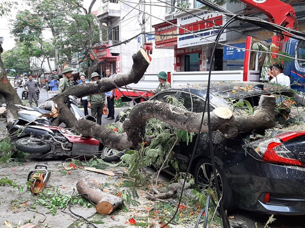 Sáng 27/7, trong cơn dông, cây phượng 70 năm tuổi tại đường Trần Bình Trọng, quận Ngô Quyền, TP Hải Phòng bị gãy đổ.