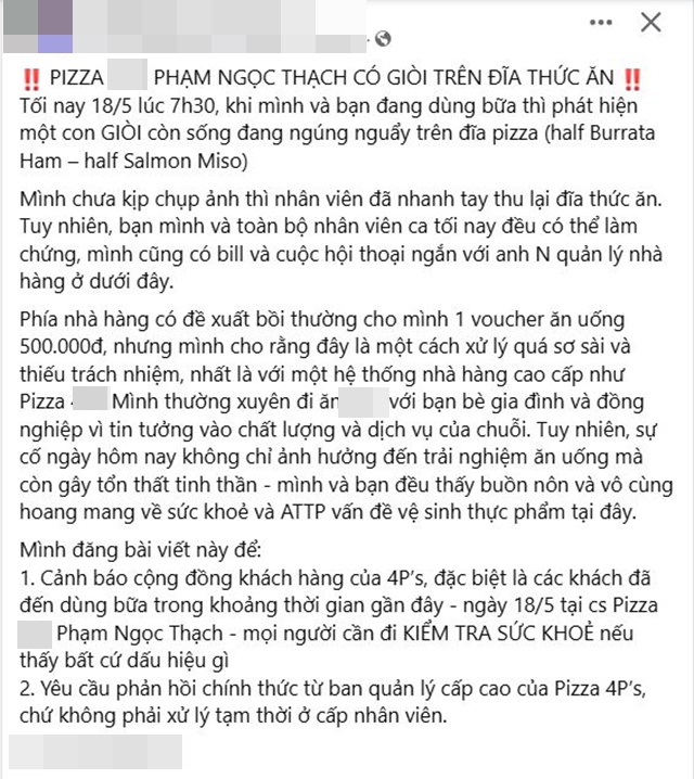 Mới đây, mạng xã hội bất ngờ lan truyền bài viết của 1 tài khoản ‘tố’ có giòi trong đồ ăn tại 1 nhà hàng Pizza nằm trong Top nhà hàng Pizza nổi tiếng nhất Hà Nội. Theo đó, tài khoản này cho biết, khoảng 7h30 tối ngày 18/5, người này cùng bạn đến 1 nhà hàng Pizza nổi tiếng trong TTTM Phạm Ngọc Thạch, Hà Nội để dùng bữa. Tuy nhiên, khi đang trong quá trình dùng bữa thì phát hiện một con giòi còn sống đang ngúng nguẩy trên đĩa pizza.