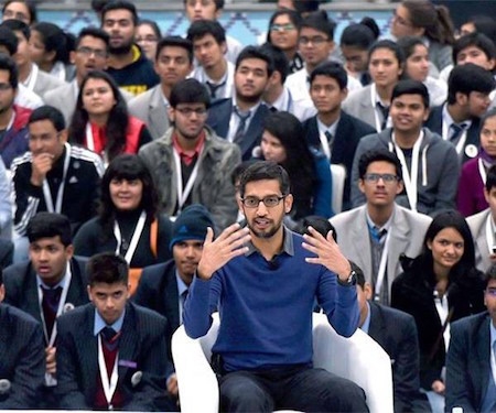 Ông Sundar Pichai đang ở Ấn Độ để tiếp xúc với lập trình viên, sinh viên và cả thủ tướng Ấn Độ Narendra Modi. Đến ngày 22/12, CEO của Google sẽ đến Hà Nội. Ảnh: The Times Indian. |