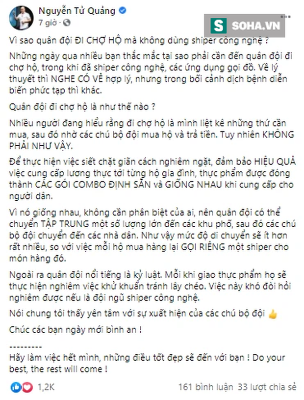 Chia sẻ về điều này trên Facebook cá nhân, CEO Bkav, ông Nguyễn Tử Quảng cho biết, những ngày qua nhiều bạn thắc mắc tại sao phải cần đến quân đội đi chợ hộ, trong khi đã có shipper công nghệ, các ứng dụng gọi đồ.