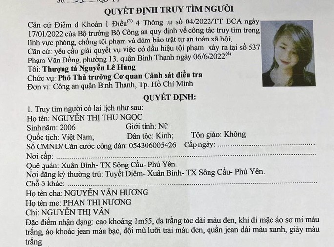 Công an quận Bình Thạnh đã ra quyết định truy tìm người để phục vụ yêu cầu giải quyết vụ việc có dấu hiệu tội phạm. Trong lúc đó, rạng sáng 13-6, Ngọc bất ngờ gọi bằng video phone về chị gái của mình và bảo rằng đang ở Campuchia, có công việc ổn định nhưng không nói rõ công việc gì. Đồng thời, Ngọc yêu cầu gia đình tìm cách gỡ bỏ các tin bài đã đăng trên các kênh thông tin truyền thông về việc tìm kiếm mình! Theo ông Hương, cách nói chuyện của Ngọc cho thấy Ngọc đang bị ai đó khống chế.