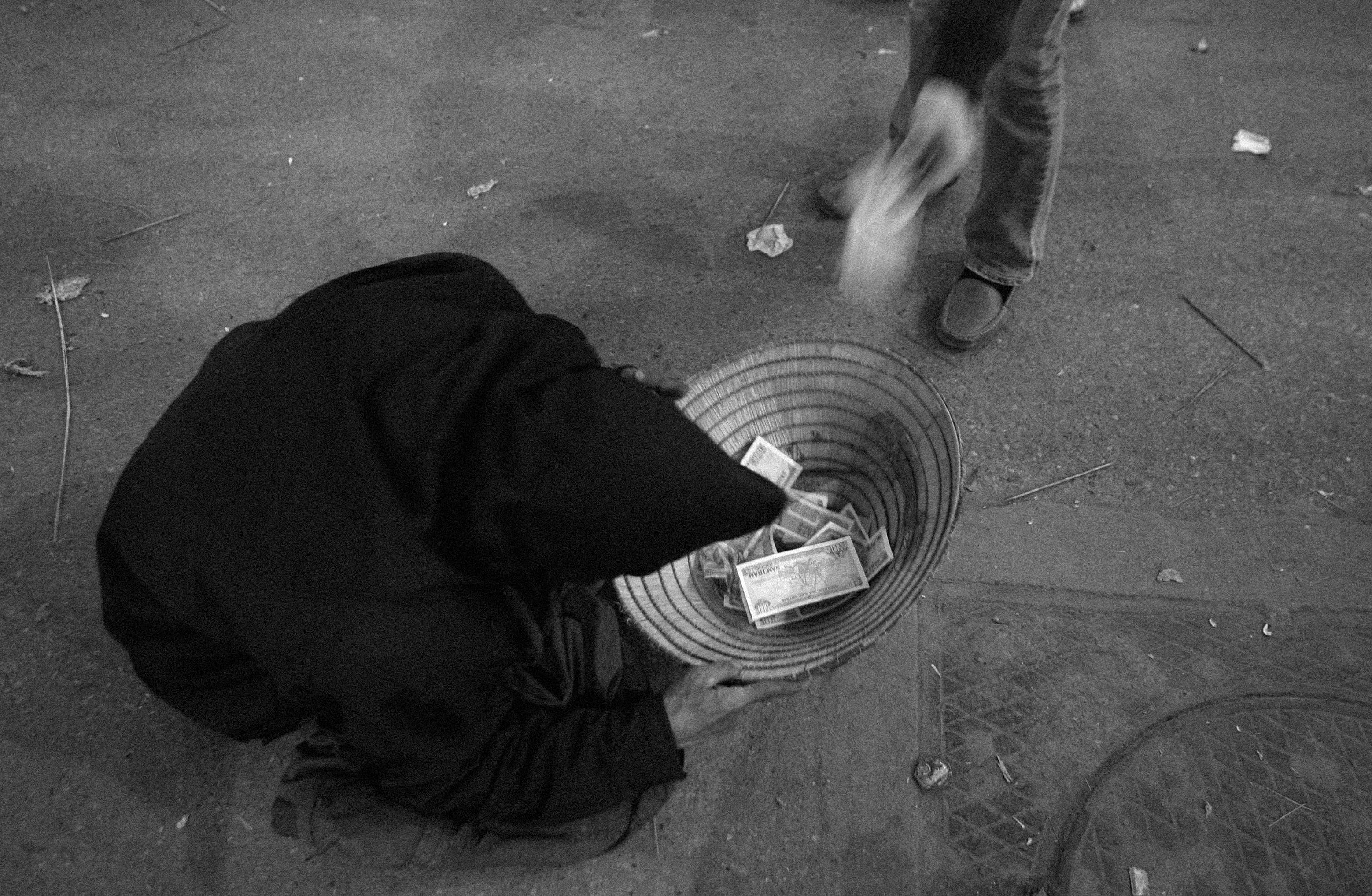 Đối diện, người phụ nữ lớn tuổi len lỏi giữa dòng người chờ đèn đỏ. Mũ chìa ra, người ngồi xe xua tay lắc đầu, bà chuyển ngay sang người khác, không nài nỉ. Mỗi lần dừng đèn đỏ 76 giây, trong khoảng 20 người được hỏi, trung bình 3 đến 4 người sẽ cho tiền.