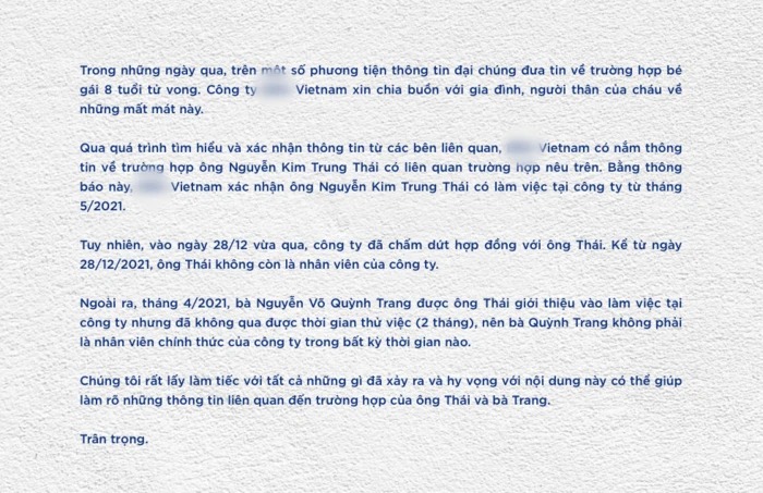 Theo thông tin từ doanh nghiệp này, Trang không phải là nhân viên chính thức của công ty trong bất kỳ thời gian nào. Tháng 4/2021, Trang được ông Thái giới thiệu vào làm việc tại công ty nhưng đã không qua được hai tháng thử việc.