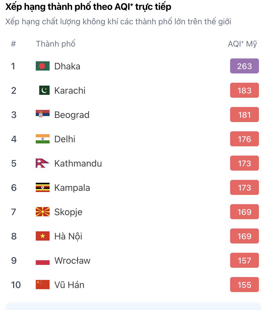 Theo hệ thống quan trắc không khí IQAir, vào lúc 9 sáng nay 21-2, Hà Nội xếp thứ 8 trong danh sách 123 thành phố ô nhiễm trên thế giới của IQAir. Cụ thể, với chỉ số AQI ở mức 169, chất lượng không khí của Hà Nội ở mức màu đỏ " không lành mạnh". Trong khi sáng qua 20-2, Hà Nội là TP có chất lượng không khí tệ nhất thế giới