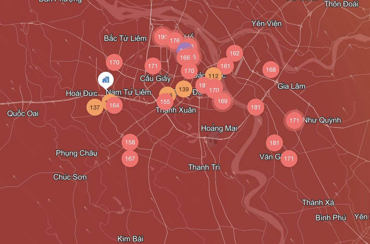 Chất lượng không khí gần P01 Ciputra, quận Tây Hồ, ghi nhận chỉ số AQI màu tím "rất không tốt" ở mức 201. Chất lượng không khí gần phố Quảng Khánh, quận Tây Hồ ghi nhận chỉ số AQI màu tím "rất không tốt" ở mức 205.