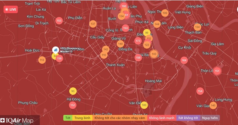 Còn theo trang IQAir (ứng dụng theo dõi chất lượng không khí trên toàn thế giới), chỉ số ô nhiễm không khí ghi nhận cao nhất tại khu vực quận Tây Hồ là 168 AQI- màu đỏ, mức xấu; quận Bắc Từ Liêm là 153 AQI- màu đỏ, mức xấu; quận Nam Từ Liêm là 156 AQI- màu đỏ, mức xấu; quận Cầu Giấy: 157 AQI- màu đỏ, mức xấu; quận Long Biên là 189 AQI- màu đỏ, mức xấu; quận Hoàn Kiếm là 173 AQI- màu đỏ, mức xấu; quận Hai Bà Trưng là 156 AQI- màu đỏ, mức xấu; quận Ba Đình 153 AQI- màu đỏ, mức xấu; quận Đống Đa là 149 AQI- màu cam, mức kém; Thanh Xuân là 110 AQI- màu cam, mức kém; quận Hà Đông là 104 AQI màu cam, mức kém; huyện Hoài Đức là 113- màu cam, mức kém; Thanh Trì là 100 AQI màu cam, mức kém; huyện Gia Lâm là 152 AQI- màu đỏ, mức xấu...