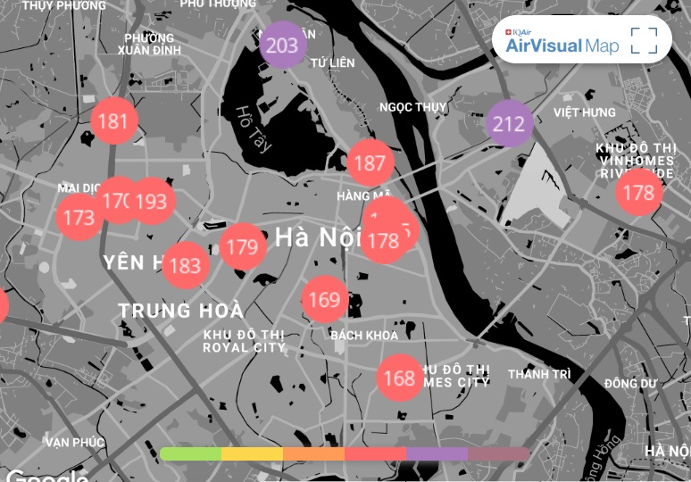 8h sáng nay (1/1), ứng dụng Air Visual hiển thị chỉ số chất lượng không khí (AQI) tại Thủ đô Hà Nội trung bình là 185 - mức màu đỏ, chỉ số này duy trì đến hết ngày hôm nay. Một số nơi trên địa bàn Hà Nội, chất lượng không khí còn vượt lên ngưỡng màu tím - cực nguy hại cho sức khỏe.