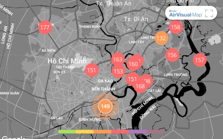 Tại TP.HCM, chất lượng không khí được Air Visual cảnh báo xấu hơn Hà Nội, giá trị AQI là 156 – tương đương ngưỡng cảnh báo màu đỏ, xen lẫn màu cam. Dự báo, trong ngày hôm nay chất lượng không khí cải thiện - ở ngưỡng màu vàng. Người dân có thể tạm thời yên tâm.