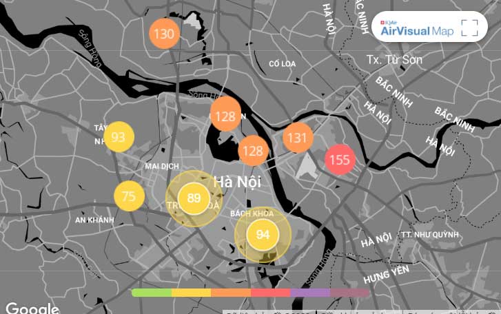 Lúc 8 giờ sáng ngày 15/1, theo ứng dụng Air Visual cho thấy, không khí đang ở ngưỡng màu vàng – mức trung bình. Tổ chức đo chất lượng không khí thế giới (Air Visual), áp dụng cách tính AQI của Mỹ cho hay, giá trị AQI là 96, người dân tạm thời yên tâm ra ngoài đi mua sắm chuẩn bị cho dịp Tết Nguyên đán Canh Tý 2020.
