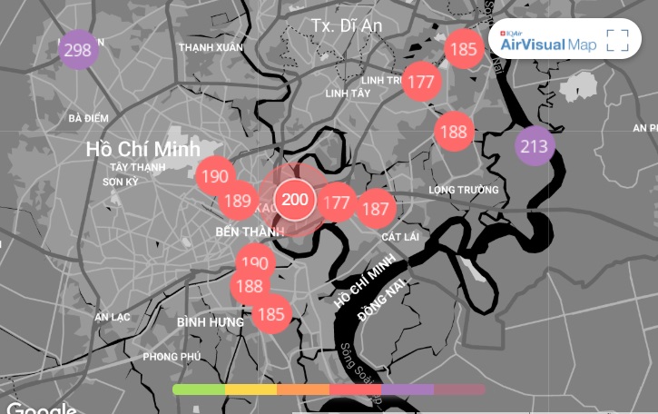 Tại TP.HCM, chất lượng không khí được Air Visual cảnh báo xấu hơn Hà Nội, giá trị AQI là 189 – tương đương ngưỡng cảnh báo màu đỏ. Đặc biệt, có hai điểm quan trắc cảnh báo chất lượng không khí ở ngưỡng màu tím - rất xấu, ảnh hưởng tới sức khỏe người dân. Dự báo, trong ngày hôm nay, chất lượng không khí TP.HCM ở mức xấu.