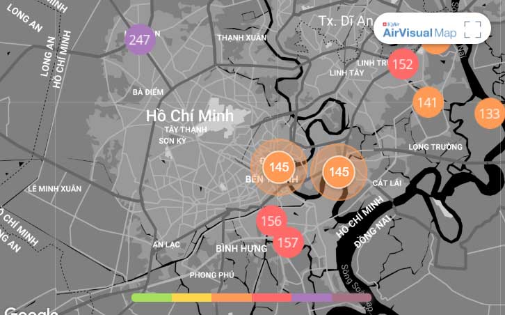 Tại TP.HCM, chất lượng không khí được Air Visual cảnh báo xấu hơn Hà Nội, giá trị AQI là 158 – tương đương ngưỡng cảnh báo màu đỏ. Hầu hết các điểm đo đều cho ra chỉ số màu đỏ - không tốt cho sức khỏe con người. AQI dao động từ trên 150 - 185, chỉ có 2, 3 điểm có chất lượng không khí ở mức màu cam - không tốt cho nhóm đối tượng nhạy cảm.