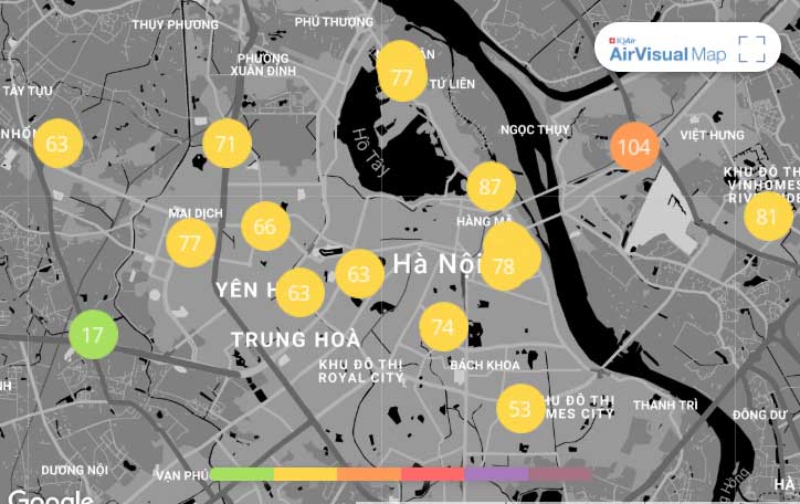 Lúc 8 giờ sáng ngày 17/1, theo ứng dụng Air Visual cho thấy, không khí đang ở ngưỡng màu vàng. Tổ chức đo chất lượng không khí thế giới (Air Visual), áp dụng cách tính AQI của Mỹ cho hay, giá trị AQI là 79.