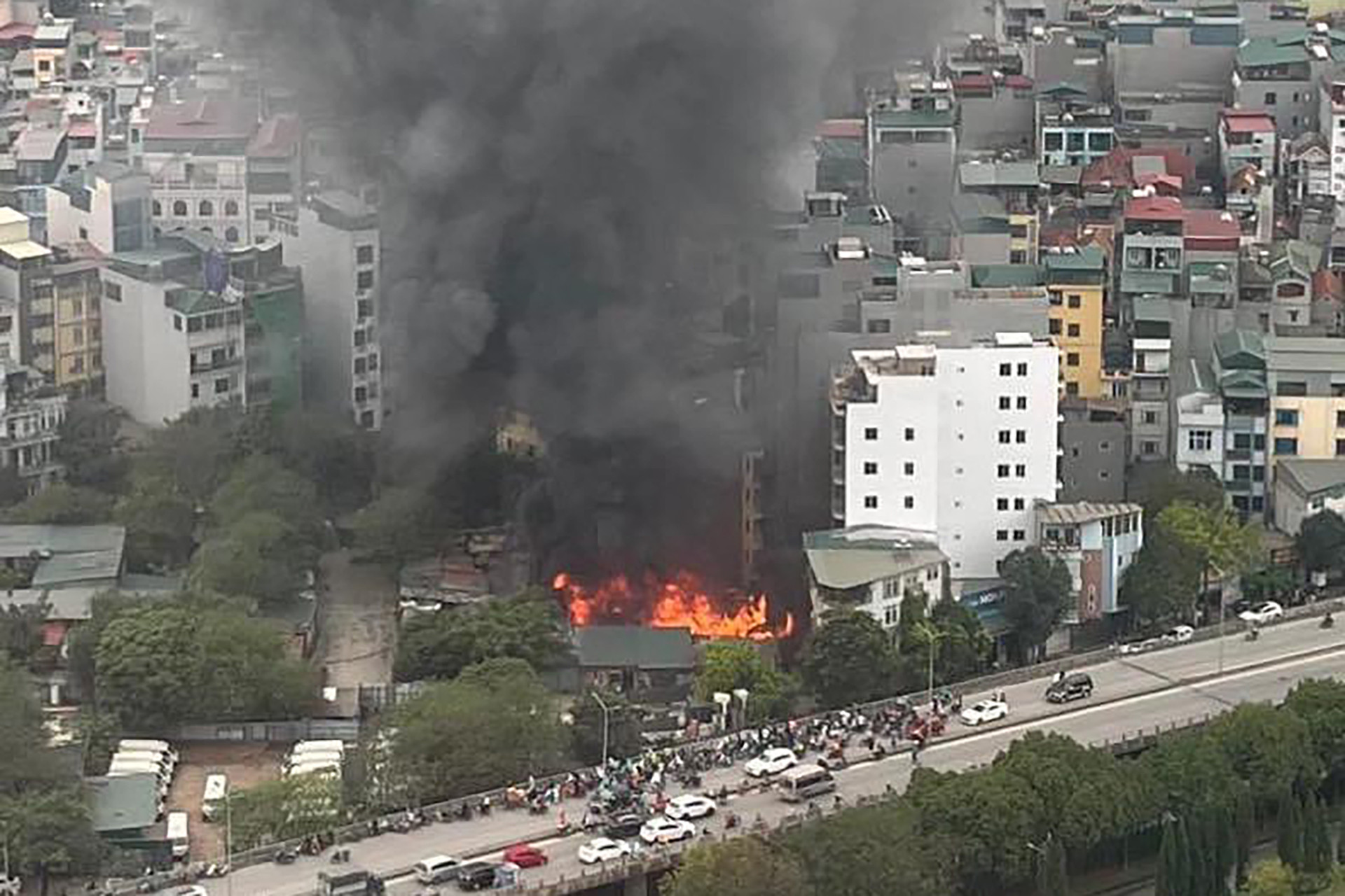 Do chất cháy là gỗ, vật liệu xây dựng bén lửa nên đã tạo cột khói lớn gây khó khăn cho việc dập lửa.