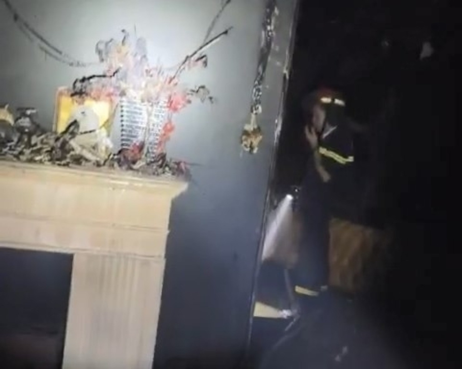 6 trinh sát PCCC và CNCH được trang bị đồ bảo hộ chống độc len lỏi vào bên trong các phòng ở tầng 6 để phun nước dập lửa và tìm kiếm các nạn nhân mắc kẹt.
