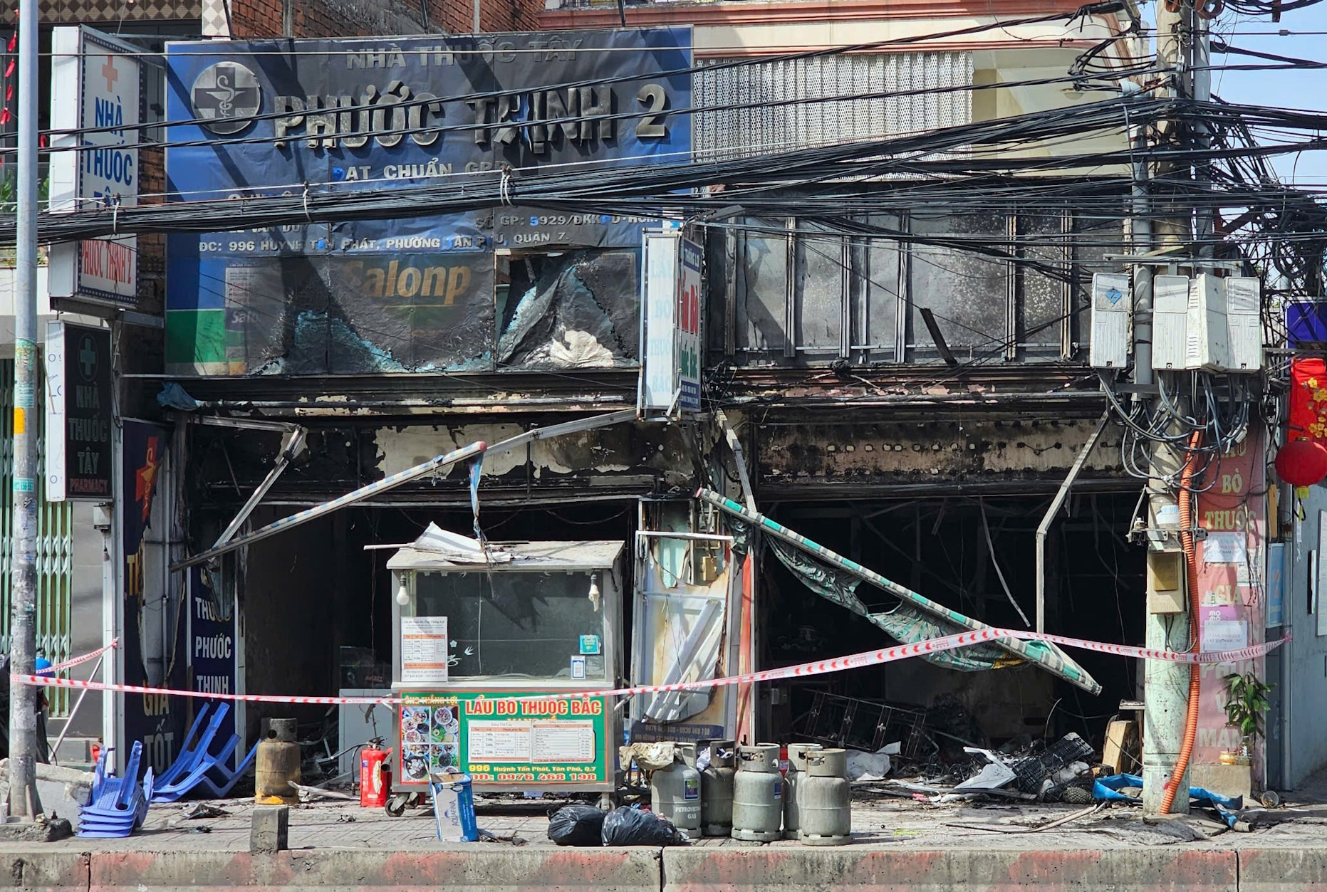 Vụ cháy không gây thương tích về người nhưng làm nhiều tài sản bên trong quán lẩu và tiệm thuốc tây bị thiêu rụi.