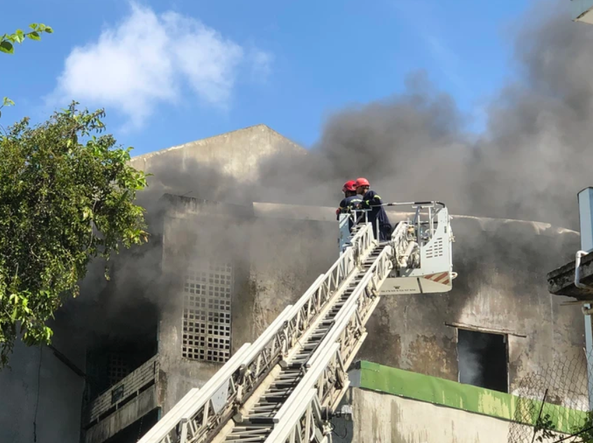 Tại hiện trường, ngọn lửa bùng phát dữ dội, cột khói đen bốc cao nghi ngút từ tầng 2 của nhà kho.