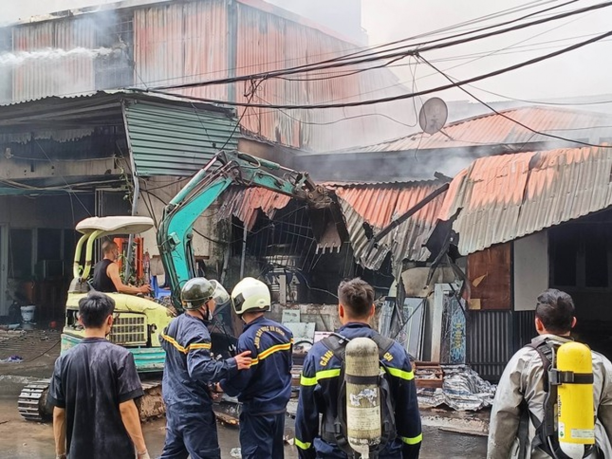 Đến khoảng 9h, đám cháy cơ bản được khống chế, lực lượng chức năng huy động máy xúc đến phá dỡ mái tôn, tường để tiếp cận bên trong. Những kho xưởng kế bên cũng đã di chuyển đồ đạc ra ngoài tránh cháy lan gây thiệt hại.