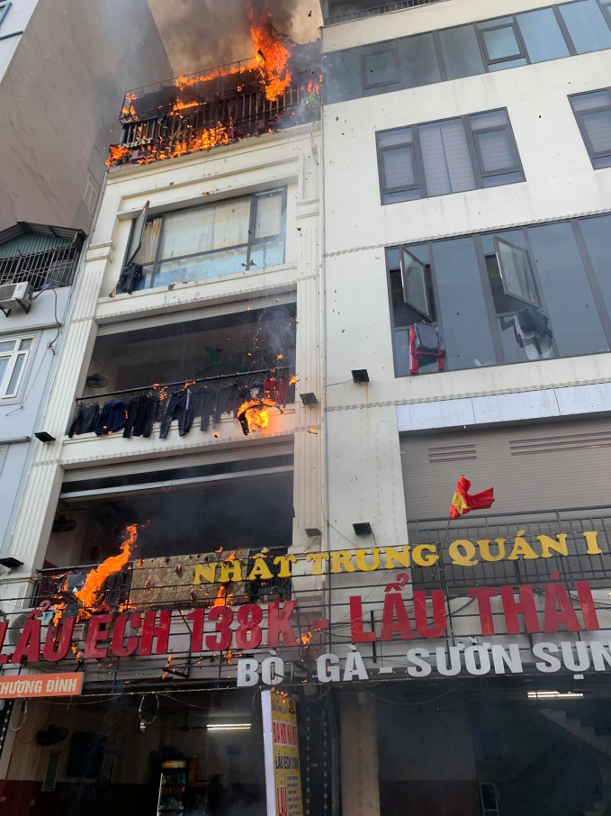 Từ tầng 5 quán lẩu ở phố Thượng Đình, lửa cháy lan xuống phía dưới, thiêu rụi nhiều tài sản.