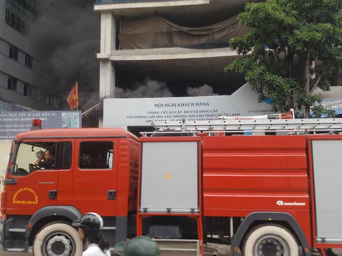 Ngọn lửa lớn bốc ra tại tầng 1 đang thi công chung cư cap cấp ở đường Tôn Thất Thuyết, Hà Nội khiến nhiều công nhân sợ hãi chạy ra ngoài thoát nạn.