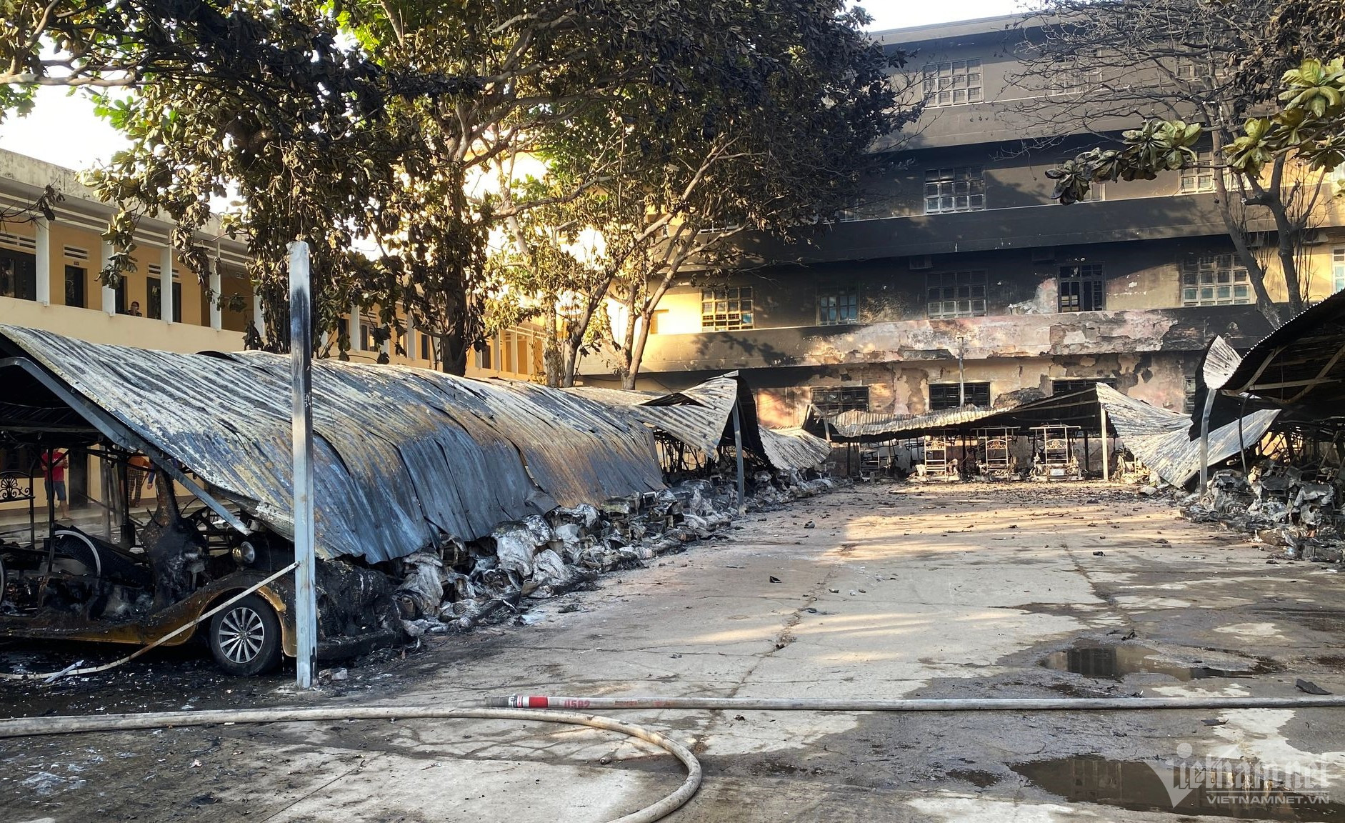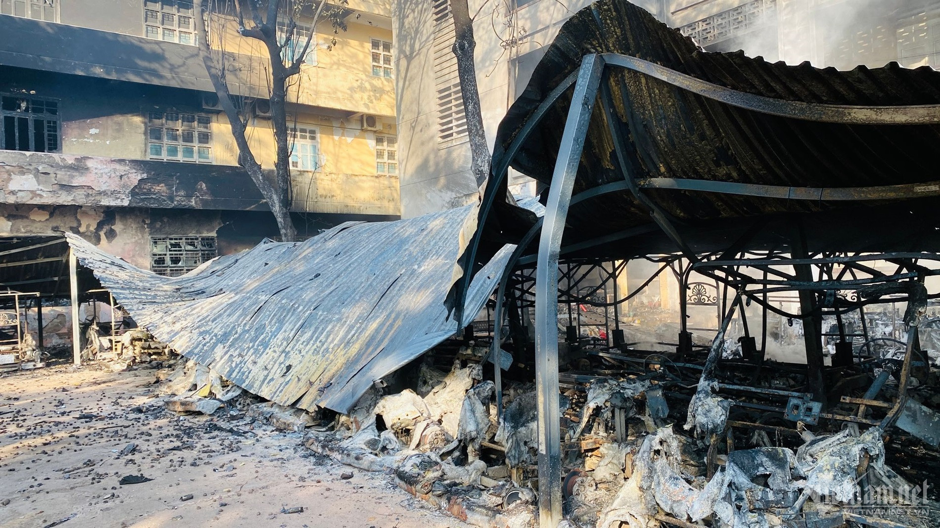 Vụ hỏa hoạn đã khiến 40 xe điện bị thiêu rụi, 1 dãy nhà bị cháy sém.
