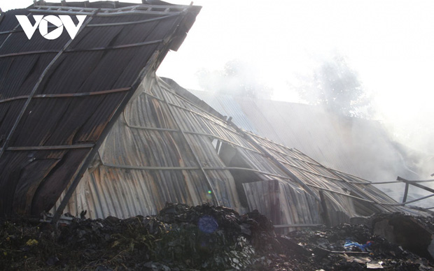 Vụ hỏa hoạn làm vựa chứa phế liệu rộng khoảng 500m² cháy, đổ sập mái tôn và một bên tường; phía trước 2 quán cà phê chòi lá bị thiêu rụi.