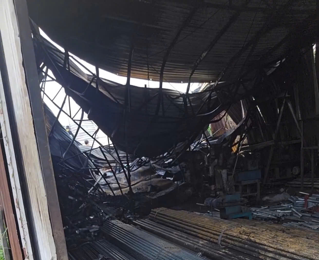 Tại hiện trường, một phần mái che nhà xưởng làm sắt đổ sập, nhiều máy móc bên trong bị hư hại nặng. May mắn, vụ cháy không có thương vong về người.