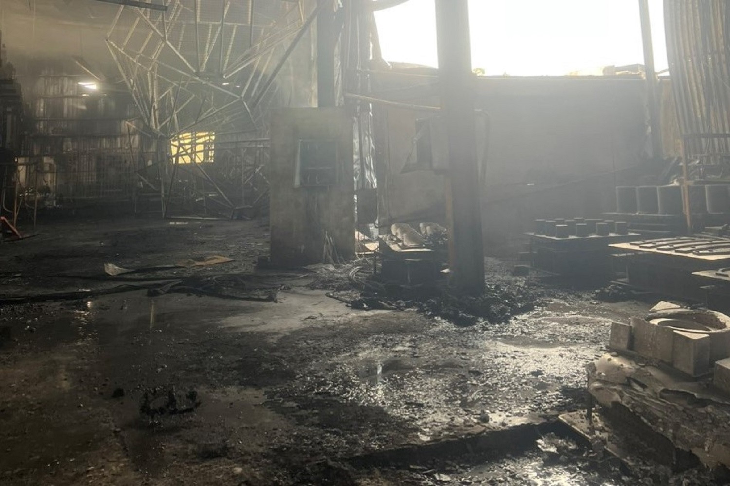 Tại hiện trường, hơn 300m2 nhà xưởng đã bị thiêu rụi, 1 phần tường và mái tôn tại đây bị đổ sập.