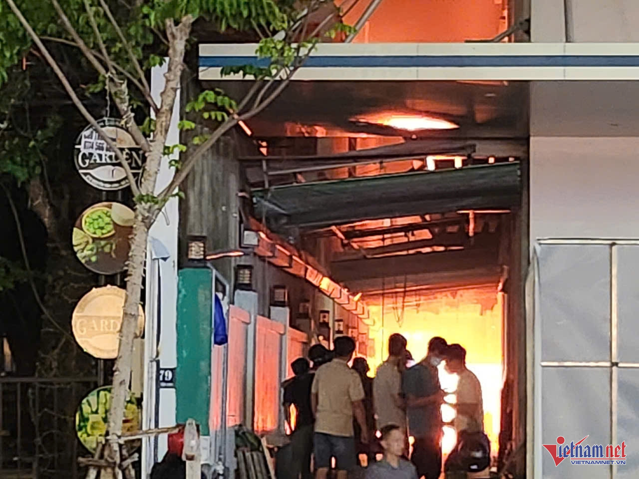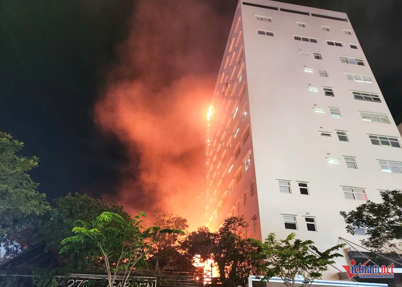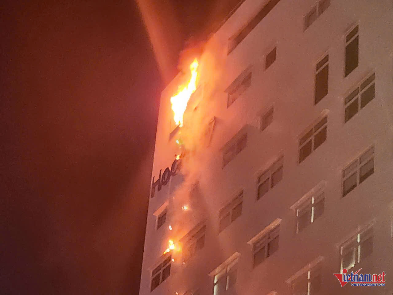 Ghi nhận của phóng viên, tấm biển được treo ở khoảng tầng 8 của tòa nhà, làm bằng điện tử và nhựa, đã bốc cháy lớn, rơi từng đốm lửa xuống phía dưới. Ngay phía dưới là không gian của một quán cà phê, do đó nguy cơ cháy lan rất cao.