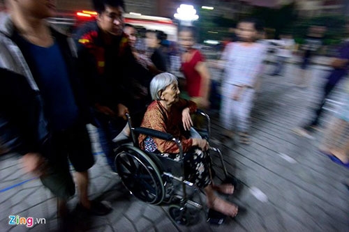 | Bà Trần Thị Nụ, 95 tuổi ở tầng 24 được lực lượng cứu hỏa đưa xuống đường. |