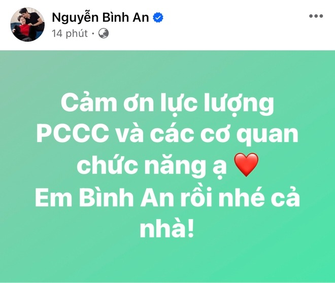 Để trấn an mọi người, tầm vài phút sau Bình An cập nhật tình hình đã được lực lượng chức năng hỗ trợ đưa ra ngoài an toàn. Anh thông báo: "Cảm ơn lực lượng phòng cháy chữa cháy và các cơ quan chức năng ạ. Tôi bình an rồi nhé cả nhà". Sau đó, nam diễn viên cũng xoá bài đăng xuất hiện trên nóc toà nhà đang cháy.