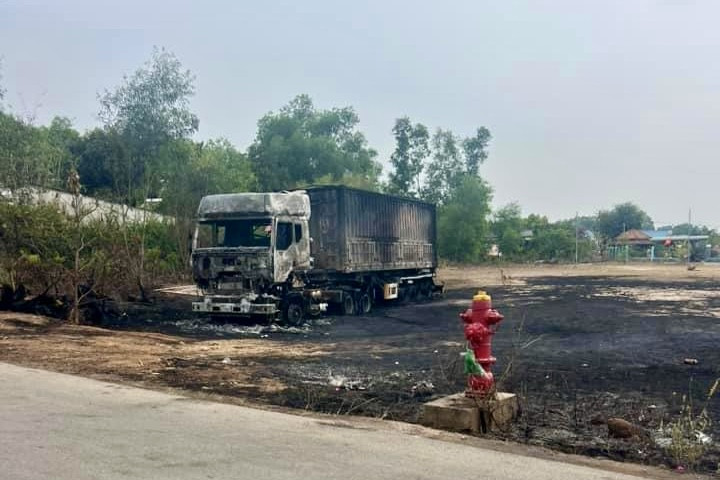 Vụ hỏa hoạn khiến xe container bị cháy rụi trơ khung; không thiệt hại về người.