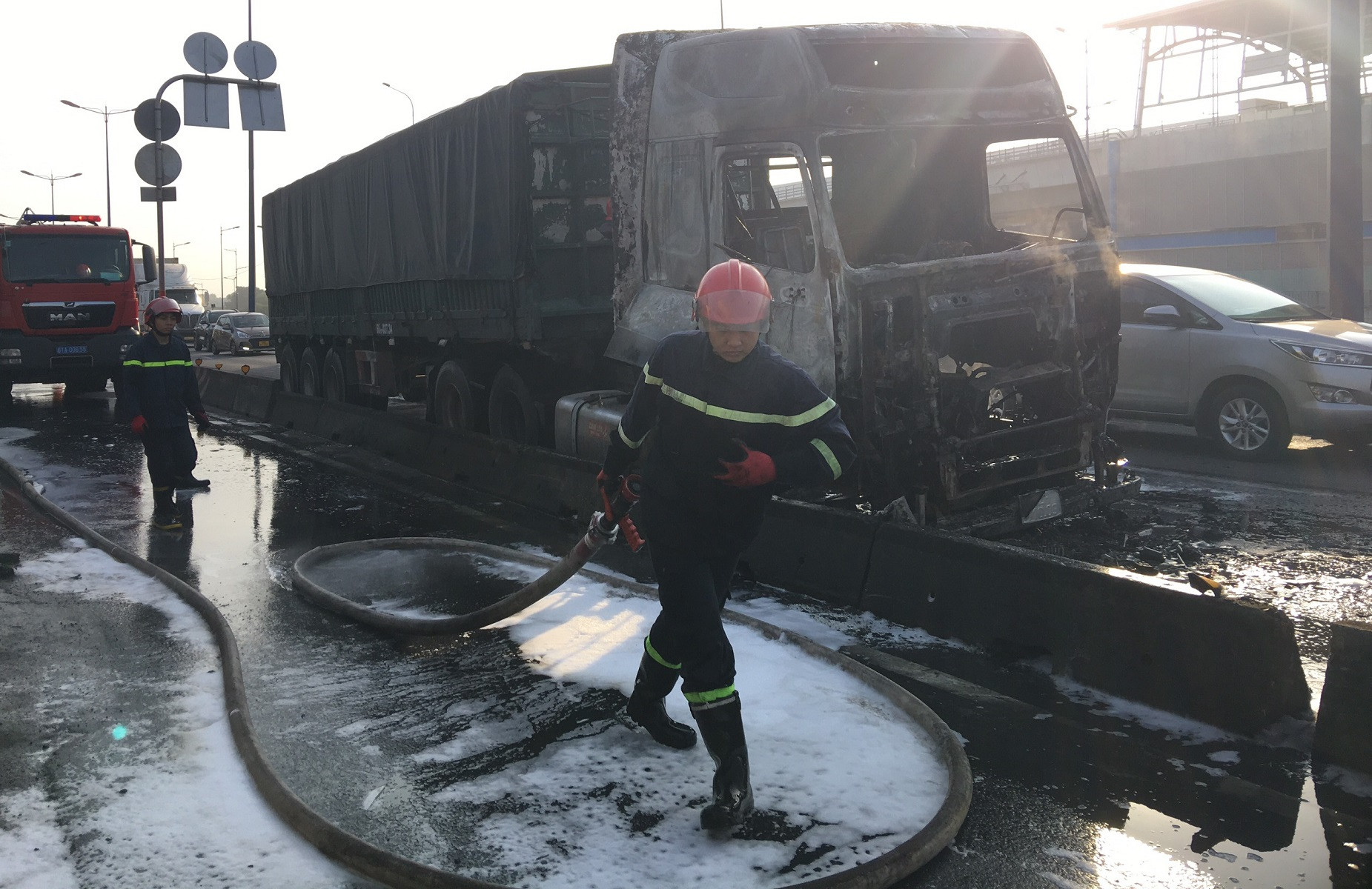 Nhận được tin báo, lực lượng PCCC huy động phương tiện đến hiện trường dập tắt đám cháy sau đó. Tại hiện trường, phần cabin xe đầu kéo bị cháy trơ khung, nhiều dầu nhớt đổ tràn trên mặt đường. Vụ cháy không có thương vong về người.