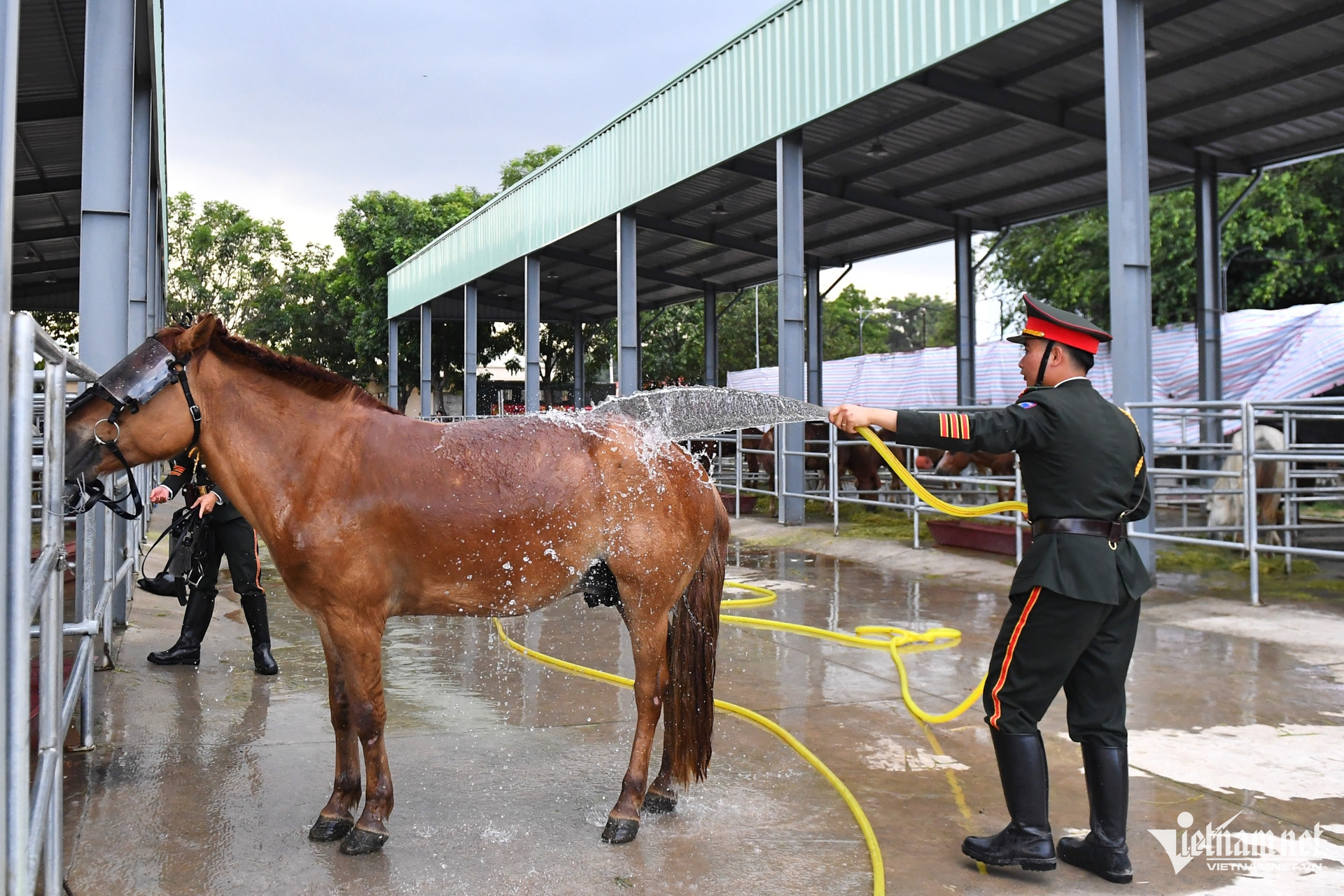 Trời nắng nóng cũng khiến ngựa đổ mồ hôi nhiều hơn trong những ngày tập luyện. Vì thế, các chiến sĩ phải tắm rửa thường xuyên cho ngựa, mỗi ngày có thể lên tới 2-3 lần.