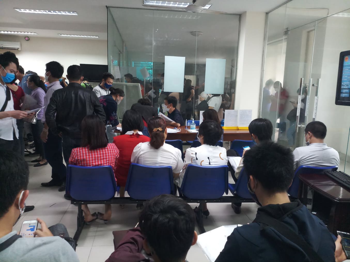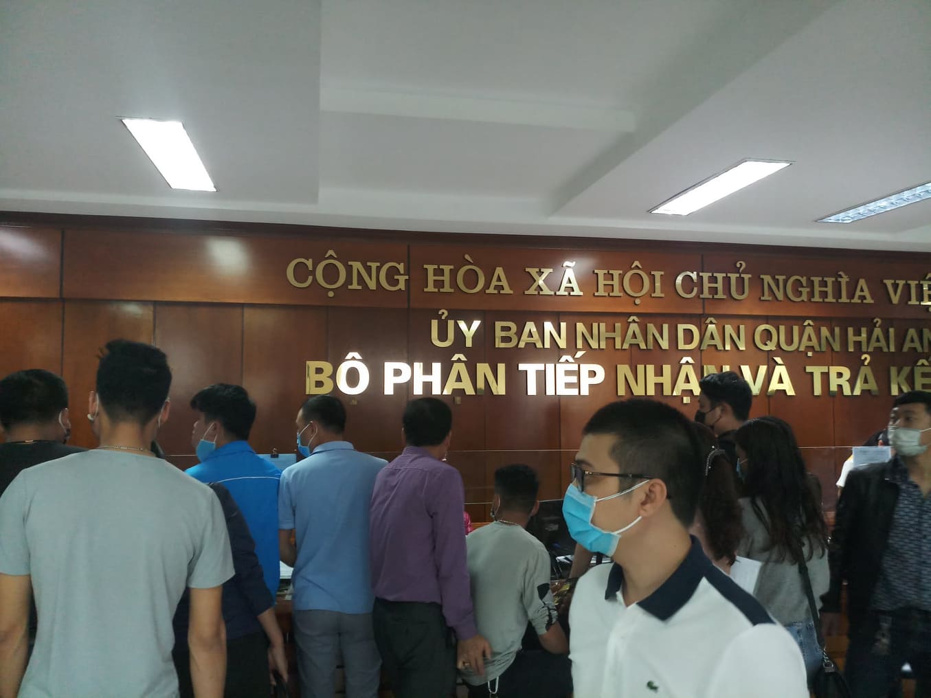 Khi bước vào bên trong văn phòng một cửa của quận Hải An, hàng trăm người đang chen lấn nhau để làm thủ tục, kẻ đứng, người ngồi, ai cũng lộ rõ sự mệt mỏi trên khuôn mặt. Giữa đợt cao điểm phòng chống dịch Covid-19, việc không tụ tập đông người và khoảng cách mỗi người cách nhau 2 mét theo khuyến cáo đã bị phá bỏ.