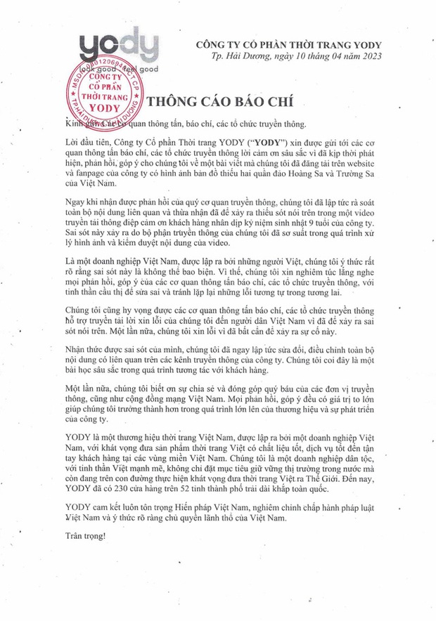 "Sai sót này xảy ra do bộ phận truyền thông của chúng tôi đã sơ suất trong quá trình xử lý hình ảnh và kiểm duyệt nội dung của video. Là một doanh nghiệp Việt Nam, được lập ra bởi những người Việt, chúng tôi ý thức rất rõ rằng sai sót này là không thể bao biện. Vì thế, chúng tôi xin nghiêm túc lắng nghe mọi phản hồi, góp ý của các cơ quan thông tấn báo chí, các tổ chức truyền thông, với tinh thần cầu thị để sửa sai và tránh lặp lại những lỗi tương tự trong tương lai" - Yody phản hồi.