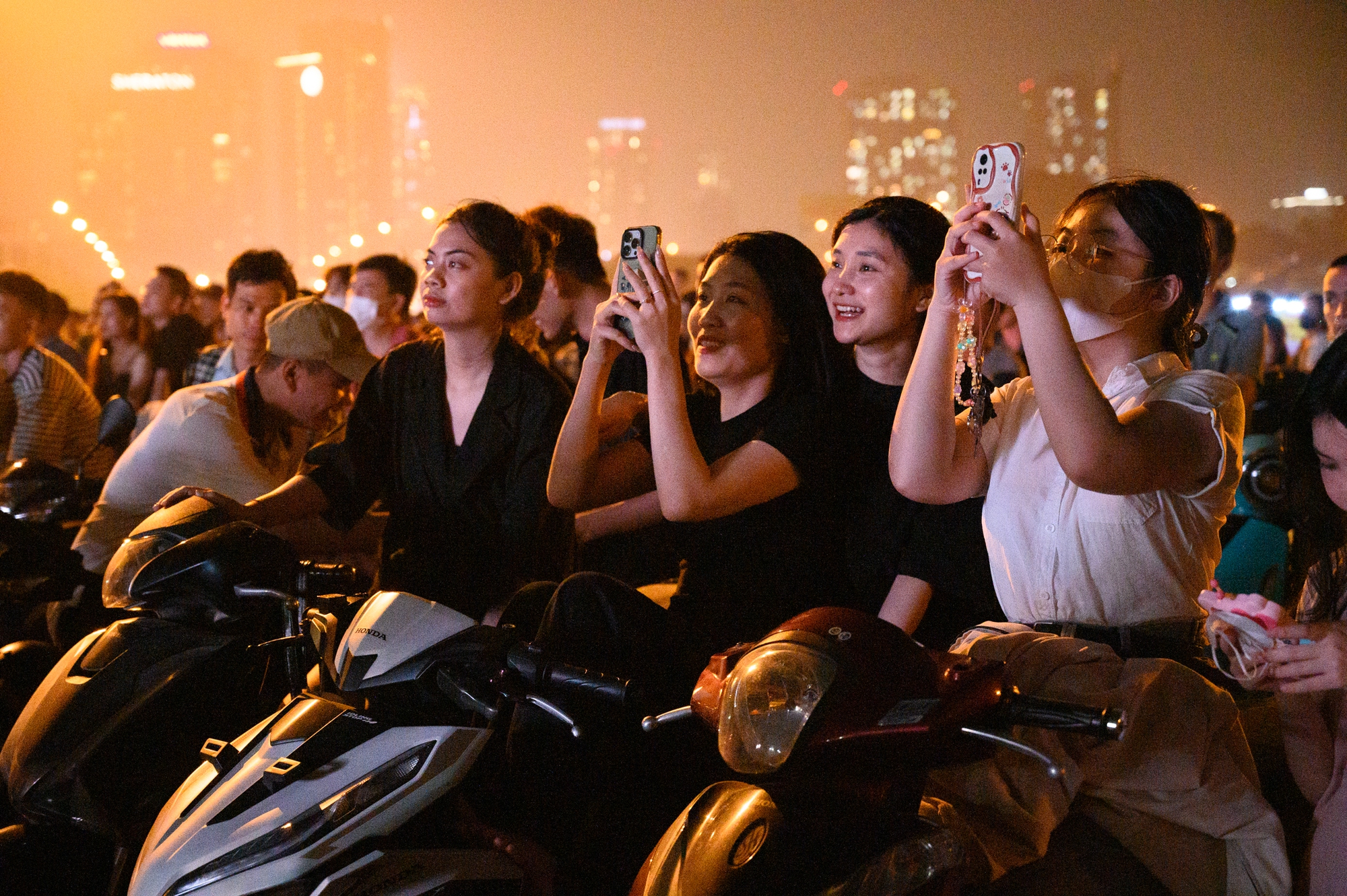 Các hàng quán vỉa hè khu vực xung quanh điểm bắn pháo hoa đều chật kín người. Ngay cả trên cây cầu vượt gần đó - một địa điểm khá lý tưởng để thưởng thức màn pháo hoa cũng chật kín.