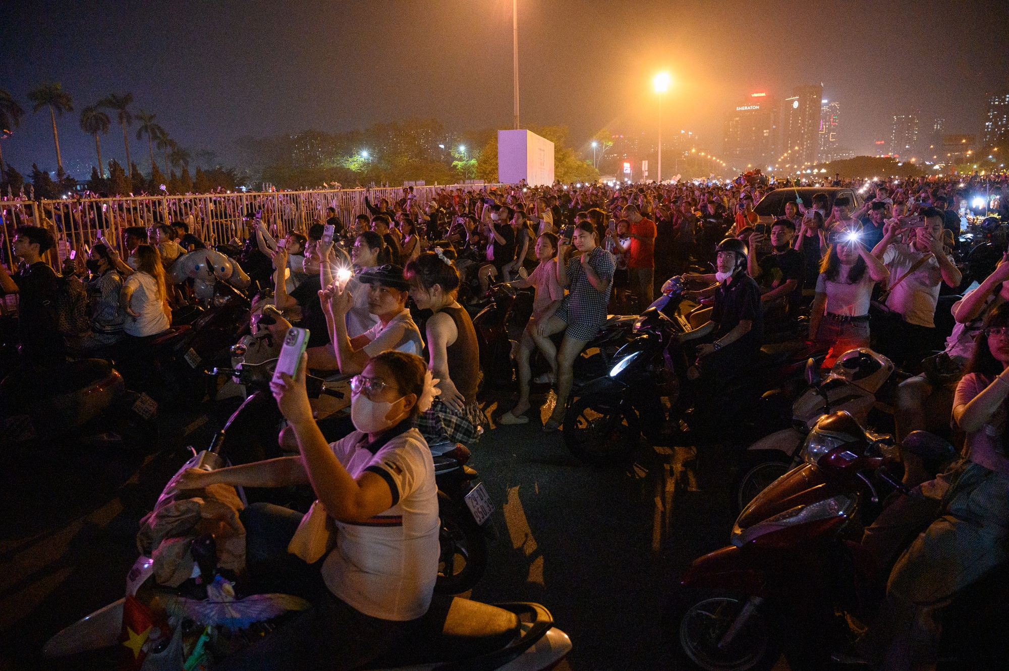 Từ khoảng 20h, hàng nghìn người dân đã đổ về khu vực này để "xí chỗ" xem pháo hoa. Lượng người và phương tiện đổ về khá lớn khiến các tuyến đường quanh khu vực đường đua F1 rơi vào tình trạng ùn tắc nhẹ.