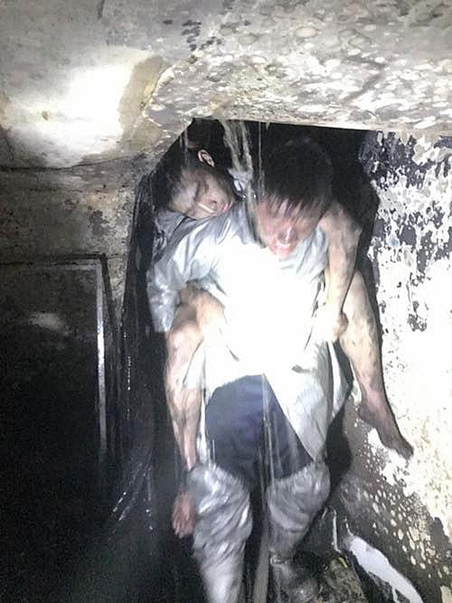 Cậu thanh niên chừng 17 tuổi nằm một góc trong căn phòng, khuôn mặt trong tư thế úp xuống sàn nhà. Hoàng đỡ nạn nhân nằm ngửa, một chiến sĩ tên Hiếu vội nhường bình thở rồi xốc nạn nhân lên lưng Hoàng.