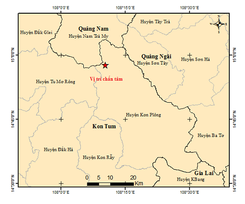 Đến 22 giờ 10 phút 55 giây tiếp tục xảy ra trận động đất có độ lớn 3.5 tại khu vực huyện Nam Trà My, tỉnh Quảng Nam.