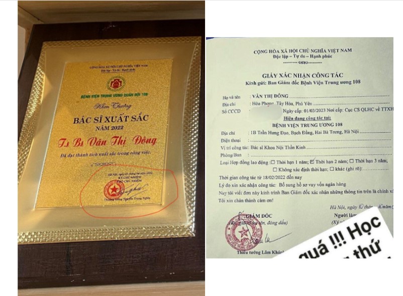 Đặc biệt, đối tượng còn làm giả bằng khen, cúp, huy hiệu "bác sĩ xuất sắc" có in logo, tên Bệnh viện Trung ương Quân đội 108 nhằm tạo uy tín, niềm tin của người khác.