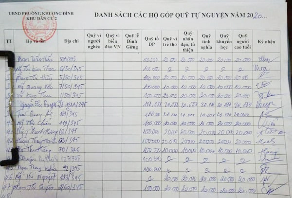 Cũng theo chị Q, năm 2020, dịch bệnh COVID-19 ập đến, ít nhiều người dân ở Hà Nội bị mất việc, giảm thu nhập. Từ tháng 5 tới giờ mới bắt đầu có hoạt động kinh tế trở lại nhưng thực tế rất nhiều người dân vẫn chưa có việc làm, việc làm chưa ổn định hoặc thu nhập bấp bênh. Thế nhưng, UBND phường Khương Đình vẫn tổ chức thu đủ các loại quỹ. Hồi cuối tháng 3/2020, gia đình chị Q bị thu 3 loại quỹ, đầu tháng 6 thì phải đóng 6 loại quỹ.