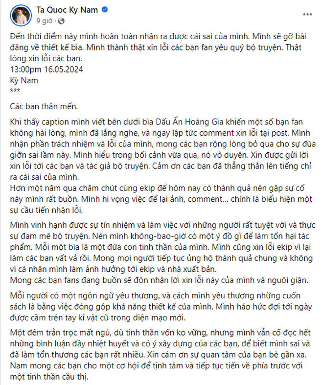Tuy nhiên trong bài chia sẻ về quá trình thiết kế bìa bộ sách DẤU ẤN HOÀNG GIA trên trang cá nhân của mình, anh Kỳ Nam đã có những phát ngôn không phù hợp, ảnh hưởng tới tác phẩm, tác giả, bạn đọc và Nhà xuất bản.