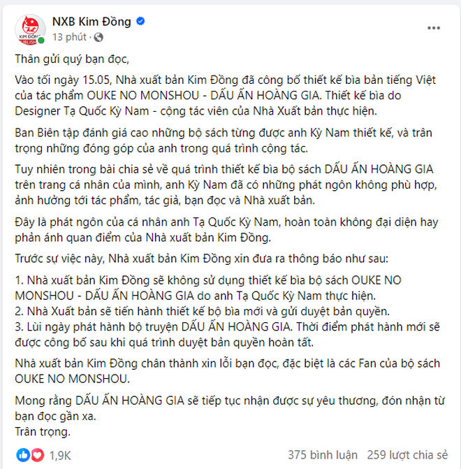 Trước sự việc này, Nhà xuất bản Kim Đồng xin đưa ra thông báo như sau: