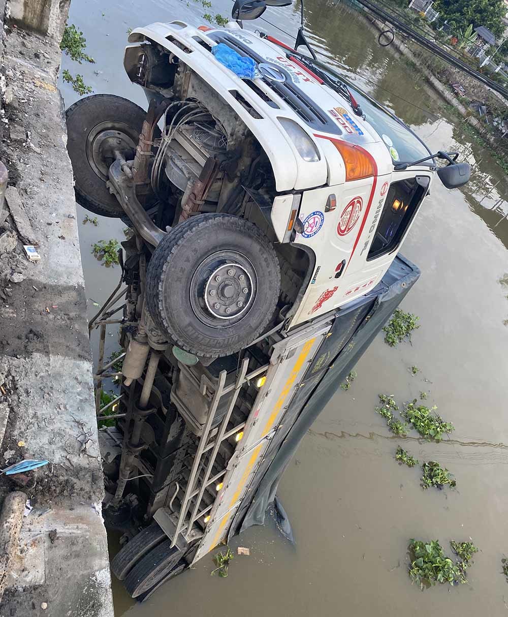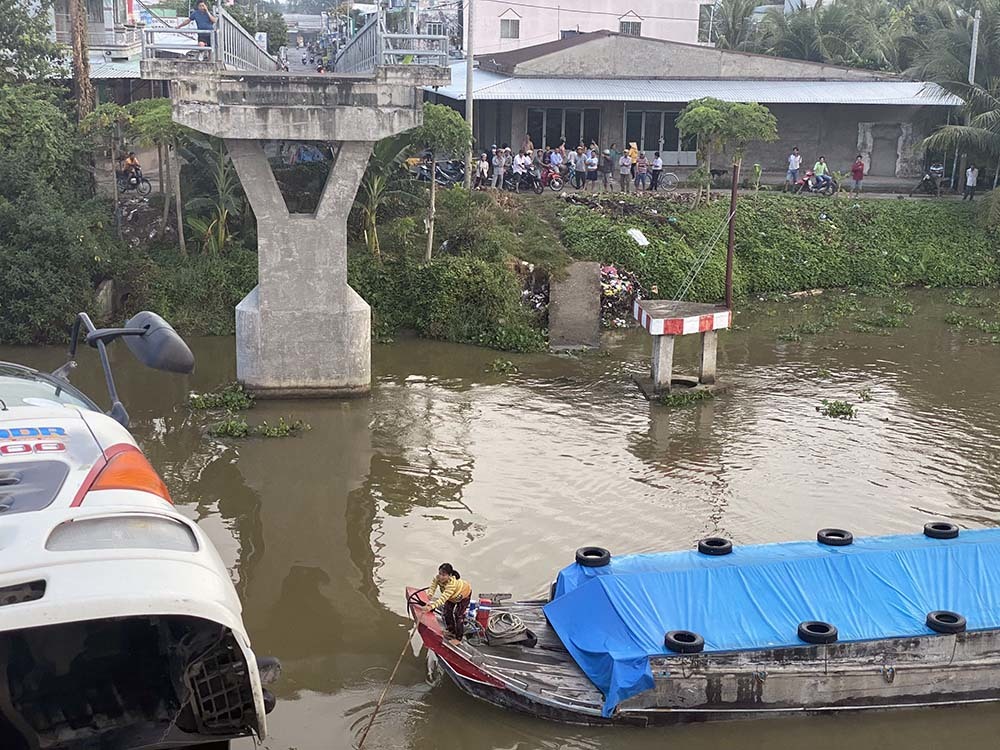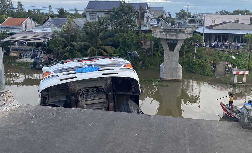 Do xe chở quá tải đã làm sập nhịp giữa của cầu. Tại hiện trường, nhịp giữa của cầu bị sập rơi xuống sông, xe tải nằm chổng giữa kênh.