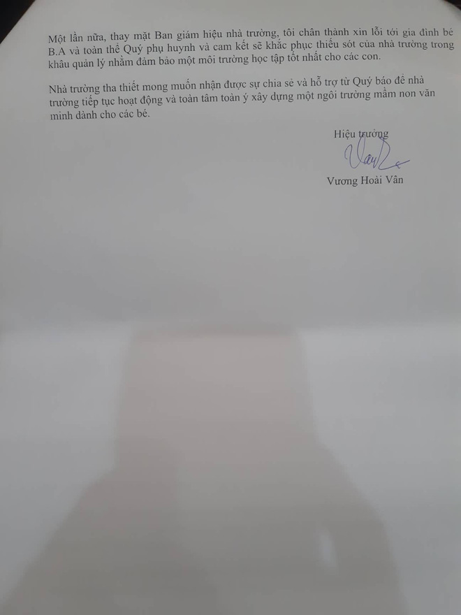 Theo bà Vân, sáng nay, cô T. đã cùng mẹ của mình và đại diện nhà trường đến tận nhà cháu B.A để xin lỗi gia đình. Trên trang facebook chính thức của hệ thống, nhà trường cũng đã gửi lời xin lỗi đến gia đình cháu B.A và toàn thể phụ huynh.