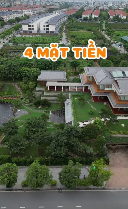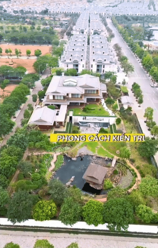 Căn biệt phủ được cho là dinh thự đẹp nhất Hà Nội với kiến trúc phong cách Nhật Bản, trong khuôn viên biệt phủ có đầy đủ tiện ích cùng rất nhiều cây xanh. Mặt trước là tiểu cảnh với hồ nước được gia chủ nuôi cá Koi và trồng sen. Toàn bộ sân vườn được trồng đủ các loại cây quý hiếm. Xung quanh căn biệt phủ là hàng rào kiên cố cao đến hơn gần 3m, đều camera giám sát để đảm bảo an ninh 24/7.