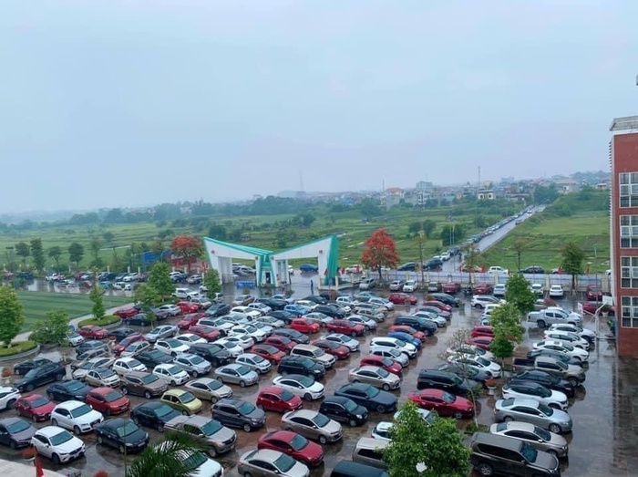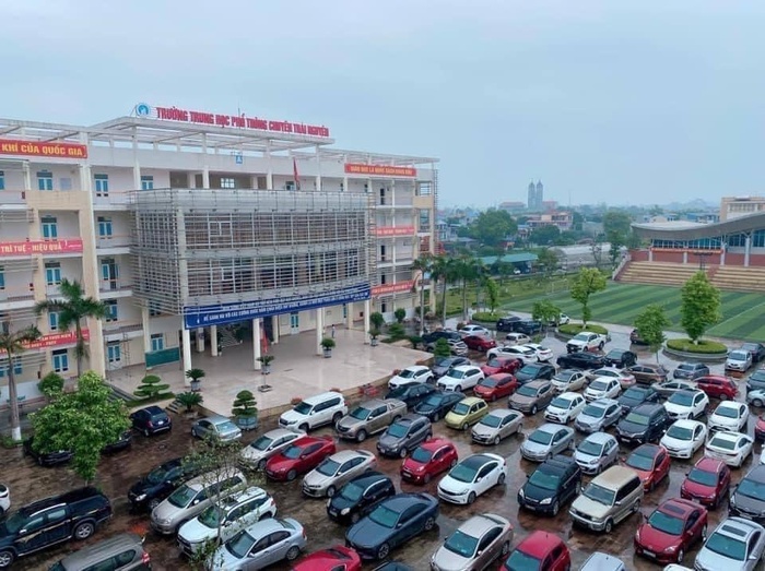 Có thể thấy, một loạt các ô tô xếp hàng dài ngay ngắn, lấp kín cả sân trường, bãi đậu xe và thậm chí là trải dài ven đường. Ai nấy cũng đều xuýt xoa trước sự "chịu chơi" của phụ huynh học sinh Thái Nguyên.