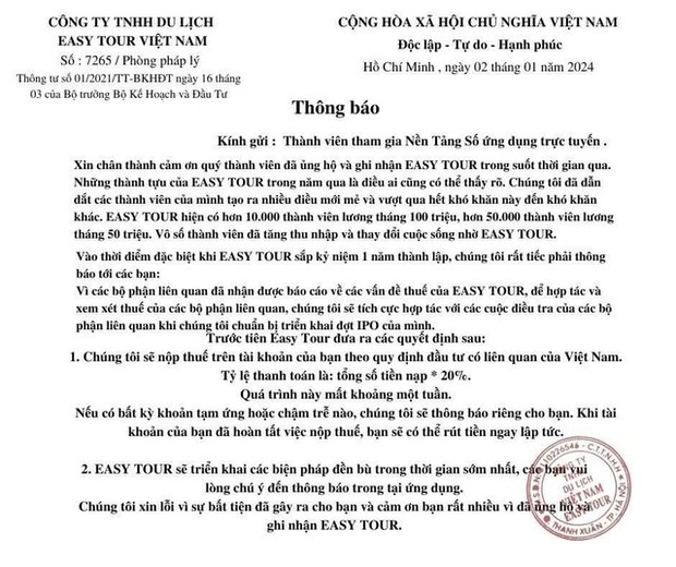 Mặc dù app đã bị sập nhưng "EASY TOUR VN" vẫn gửi thông báo nhà đầu tư muốn rút được số tiền đã nộp, công ty sẽ nộp thuế thay với tỉ lệ thanh toán là 20% trên tổng số tiền đã nạp và quá trình sẽ mất khoản 1 tuần để xử lý.